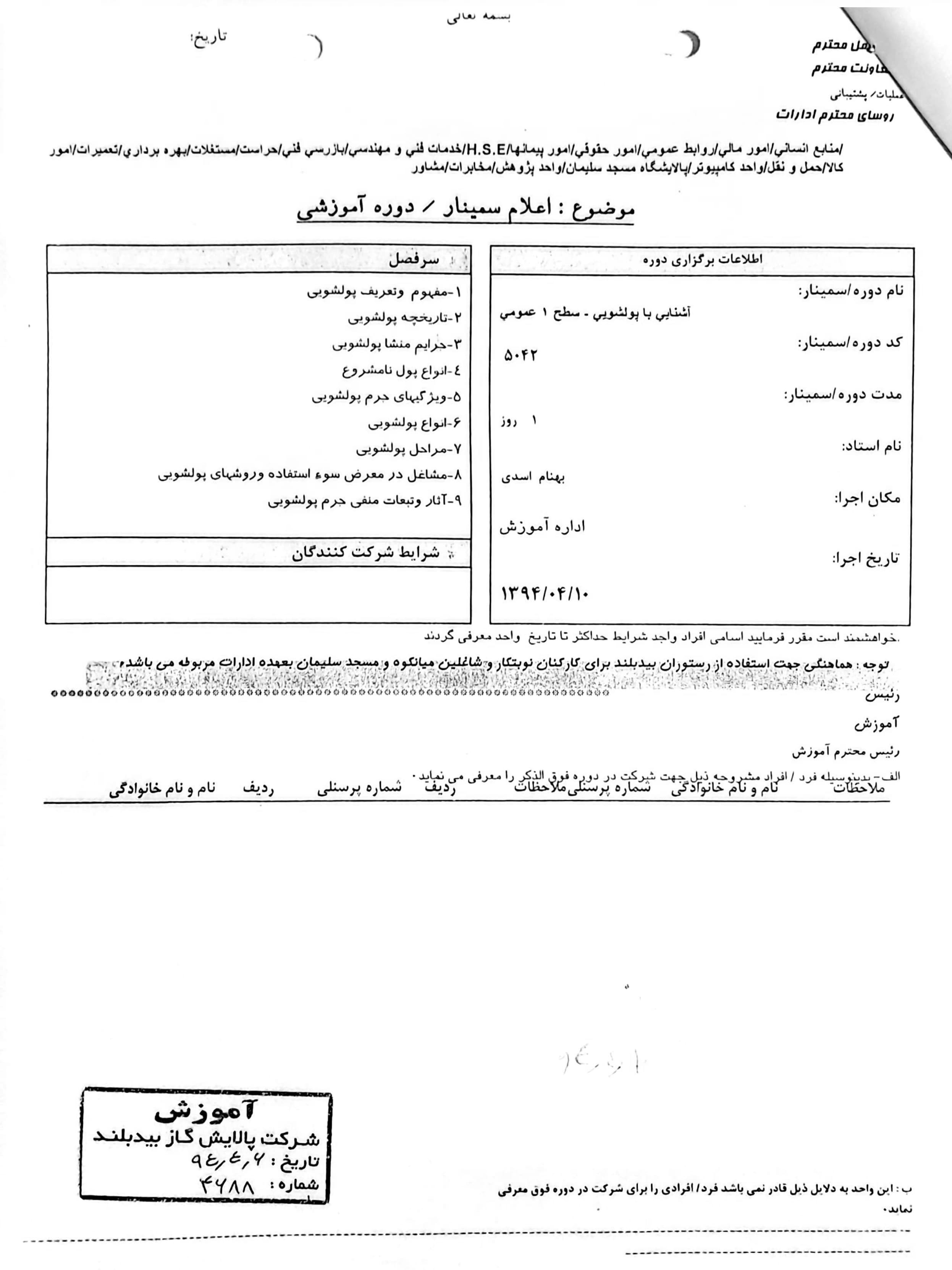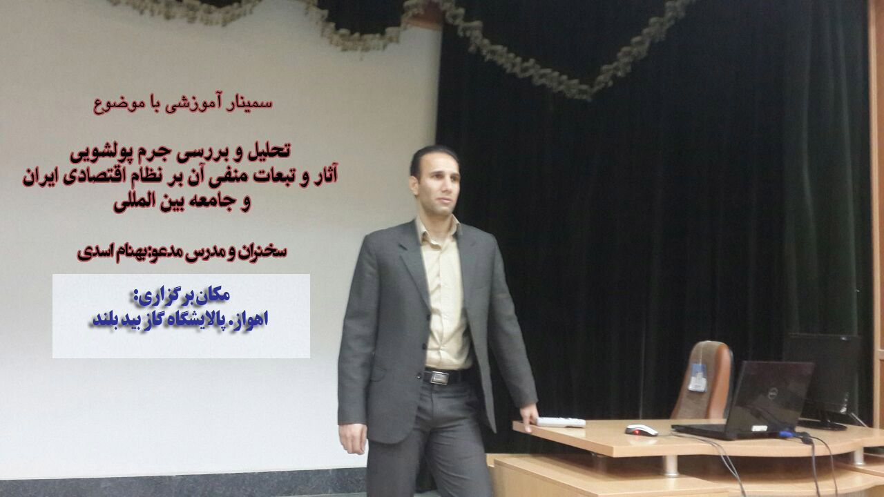 این کارگاه آموزشی با عنوان بررسی جرم پولشویی (آثار و تبعات منفی آن بر نظام اقتصادی ایران و جامعه بین المللی توسط استاد بهنام اسدی در تاریخ 1394/04/10 از ساعت 8 صبح الی 1 به صورت حضوری در سالن همایش پالایشگاه بیدبلند اهواز (بهبهان) برگزار شد و هدف اصلی آن افزایش آگاهی تخصصی کارکنان نسبت به ماهیت پولشویی، سازوکارهای رایج آن و پیامدهای گستردهاش در سطح بینالمللی بود.