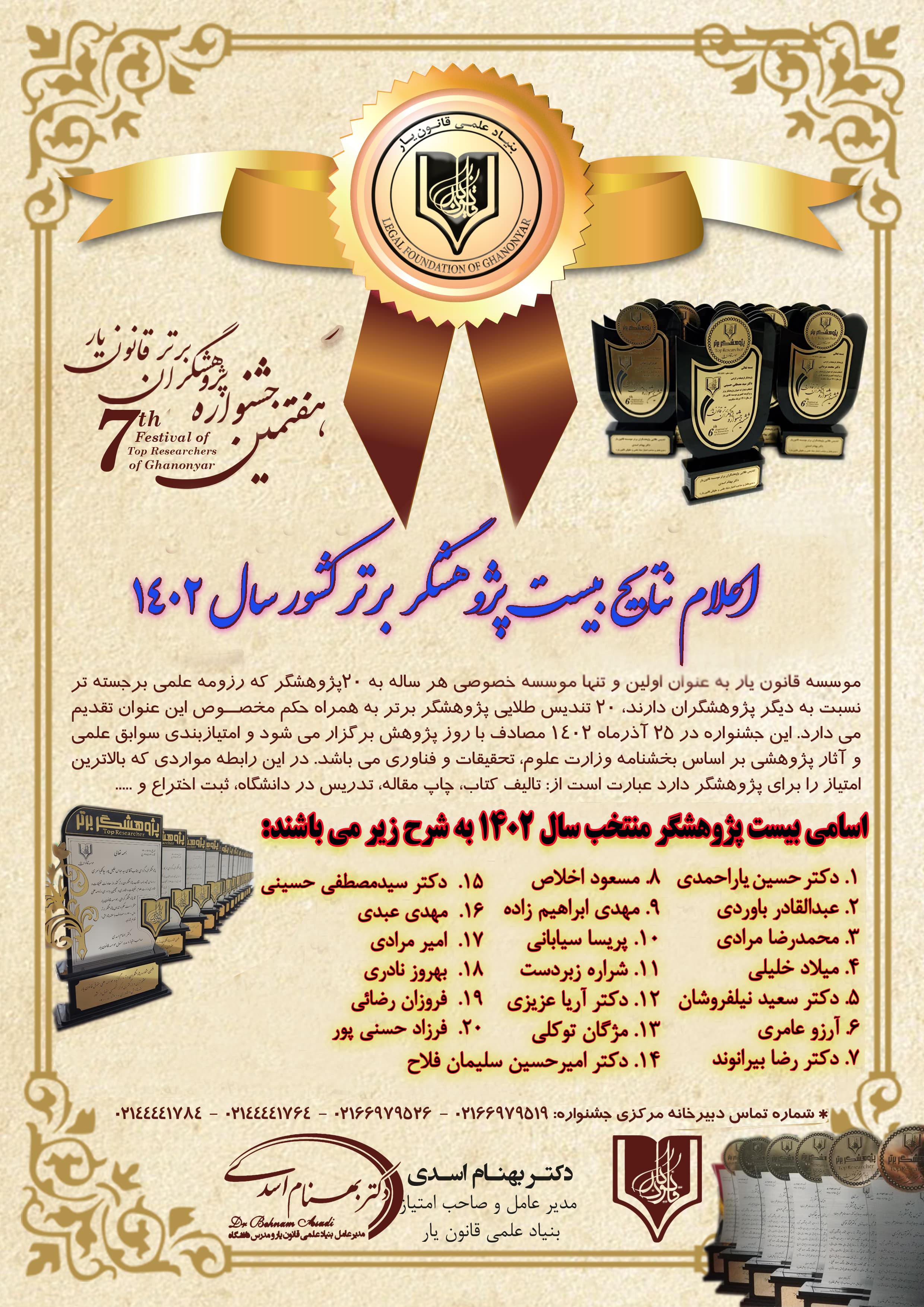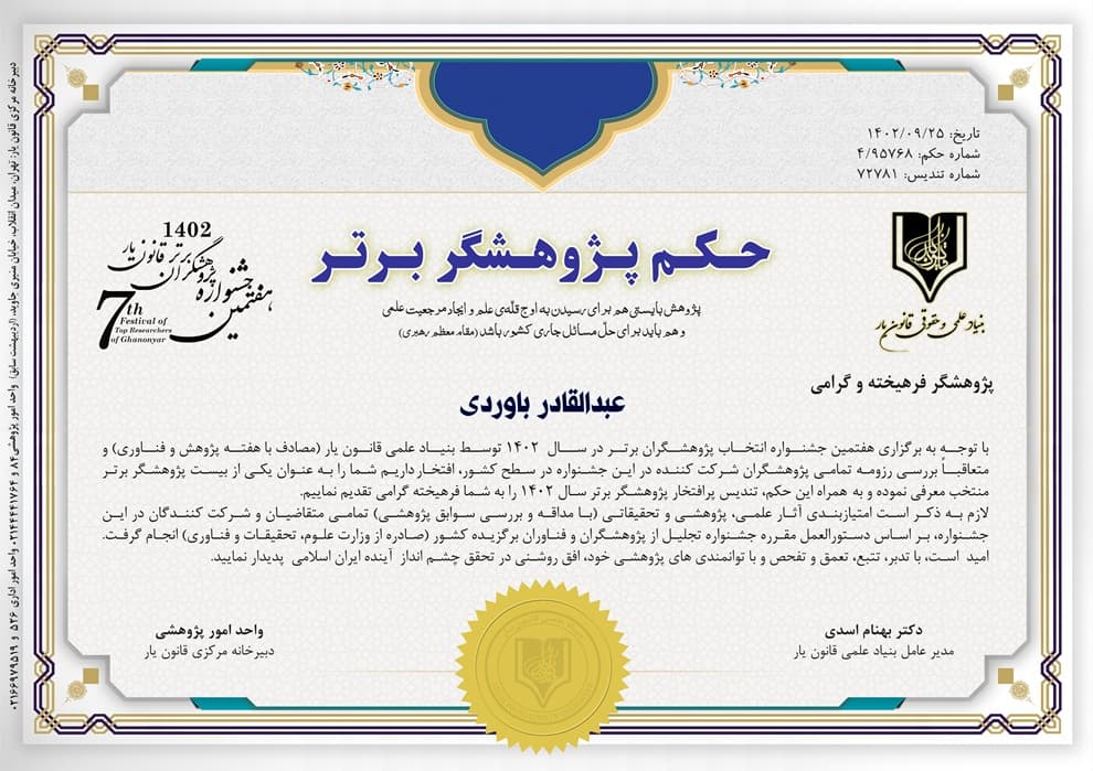 موسسه قانون یار به عنوان یک نهاد علمی برخود وظیفه می داند هر ساله به مناسبت روز پژوهــش (مصادف با     آذرماه) به پژوهشگران فعـال جامعه علمی کشور، بیست تندیس طلایی به همراه حکم پژوهشگر برتر به رسم یادبود و به منظور تشـویق پژوهشگران فرهیخته  کشــور اهـدا نمایــد. امتیاز بندی آثار علمی، پژوهشی و تحقیقاتی (با مداقه و بررسی سوابق پژوهشی) تمامی متقاضیان و شرکت کنندگان در این فراخوان،  بر اساس دستورالعمل بیست و چهارمین جشنواره تجلیل از پژوهشگران و نوآوران برگزیده کشور (صادره از وزارت علوم، تحقیقات و فناوری) می باشد. نهایتاً با توجه به برگزاری پنجمین دوره جشنواره انتخاب پژوهشگران برتر کشور در سال 1402 توسط بنیاد علمی قانـون یار در هفته پژوهش و فناوری، به شرح لیست ذیل جهت دریافت حکم و تندیس پژوهشگر برتر سال 1402به واحد پژوهش موسسه قانون یار معرفی و اعلام می گردند: