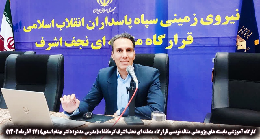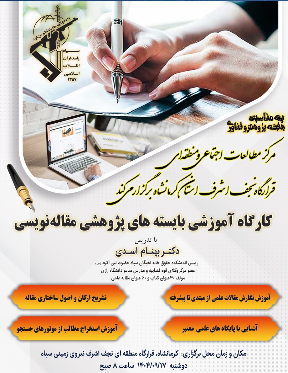 واحد پژوهش و فناوری قرارگاه نجف اشرف نیروی زمینی سپاه کرمانشاه در راستای ارتقای سطح علمی، پژوهشی و توانمندسازی مهارتی کارکنان، اقدام به برگزاری کارگاه تخصصی مقالهنویسی علمی در تاریخ 17 آذرماه 1404 نمود. در این کارگاه، شرکتکنندگان با اصول و مراحل نگارش مقاله علمی، ساختار استاندارد مقالات، روشهای انتخاب موضوع، شیوه صحیح ارجاعدهی، پرهیز از سرقت علمی و نحوه ارسال مقاله به مجلات علمی آشنا شدند.