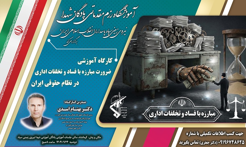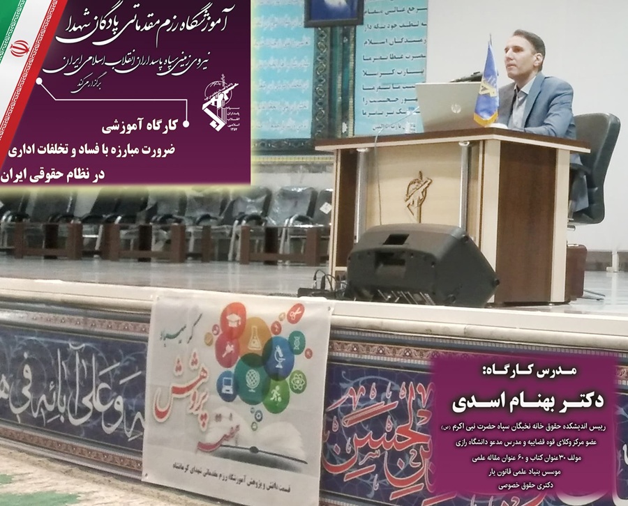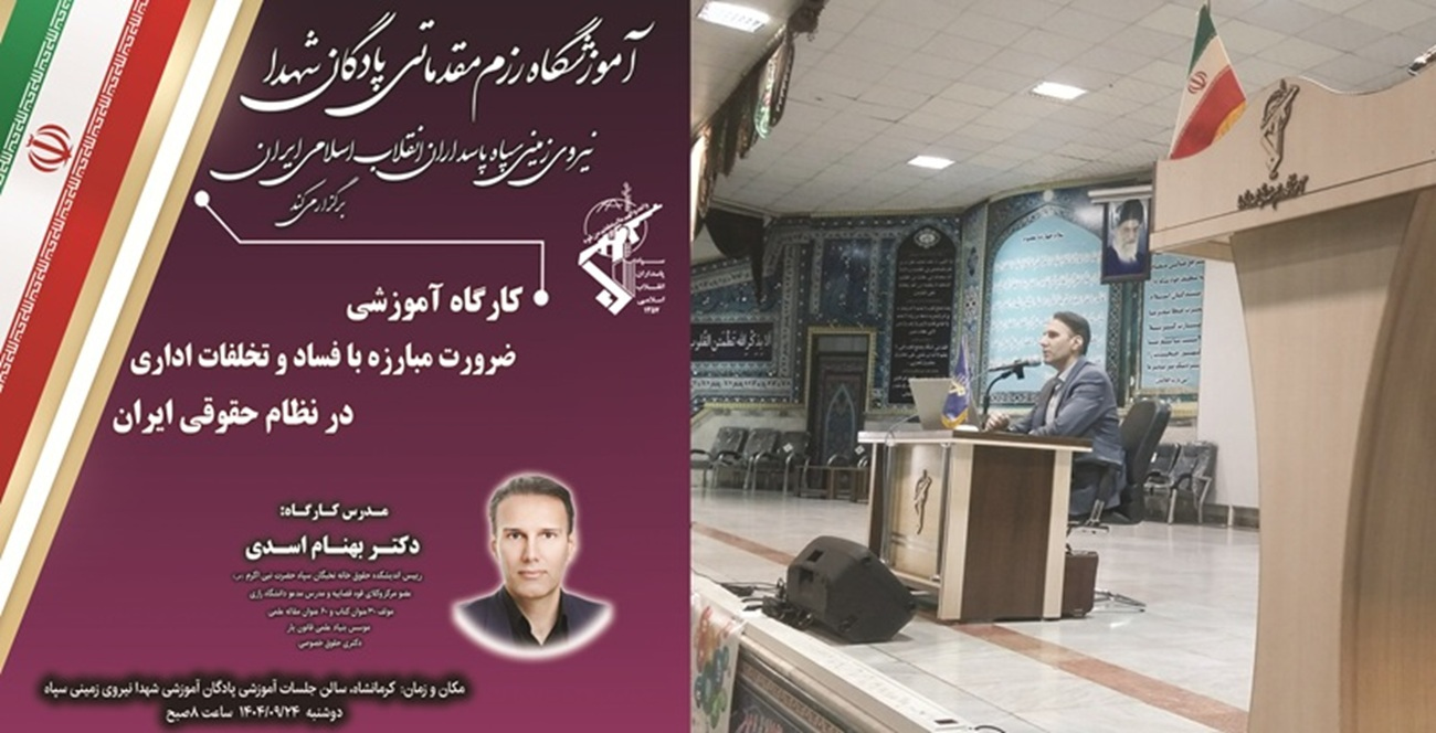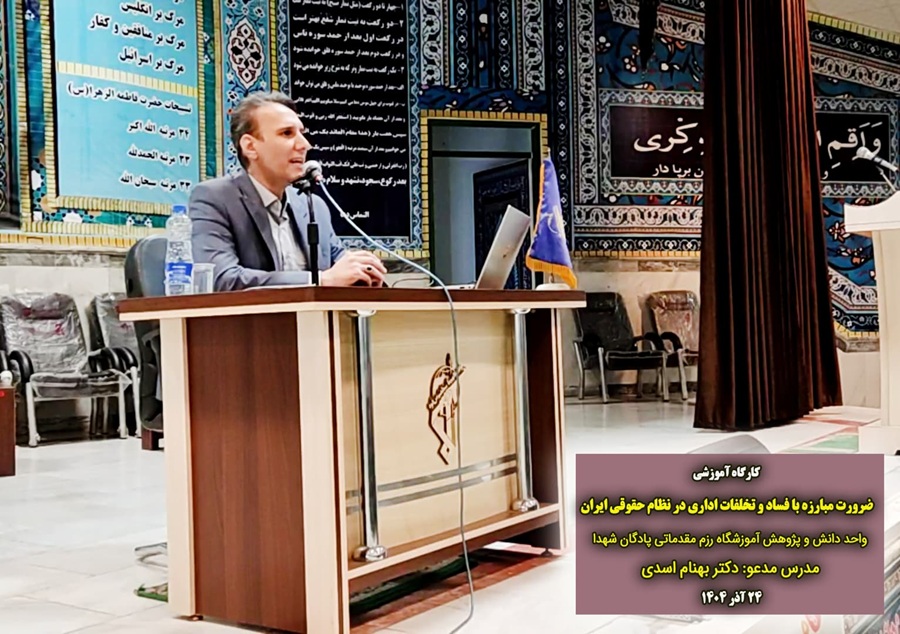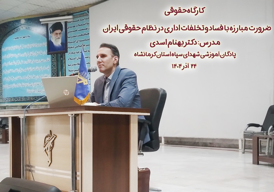 به مناسبت هفته پژوهش، در تاریخ 1404/09/24 کارگاه آموزشی با عنوان «ضرورت مبارزه با فساد و تخلفات اداری در نظام حقوقی ایران» در پادگان آموزشی شهدای سپاه استان کرمانشاه برگزار شد. این کارگاه حقوقی با هدف تبیین مبانی نظری و الزامات حقوقی پیشگیری و مقابله با فساد اداری در نظام حقوقی جمهوری اسلامی ایران تشکیل گردید.اهداف این کارگاه حقوقی عبارت بودنداز: